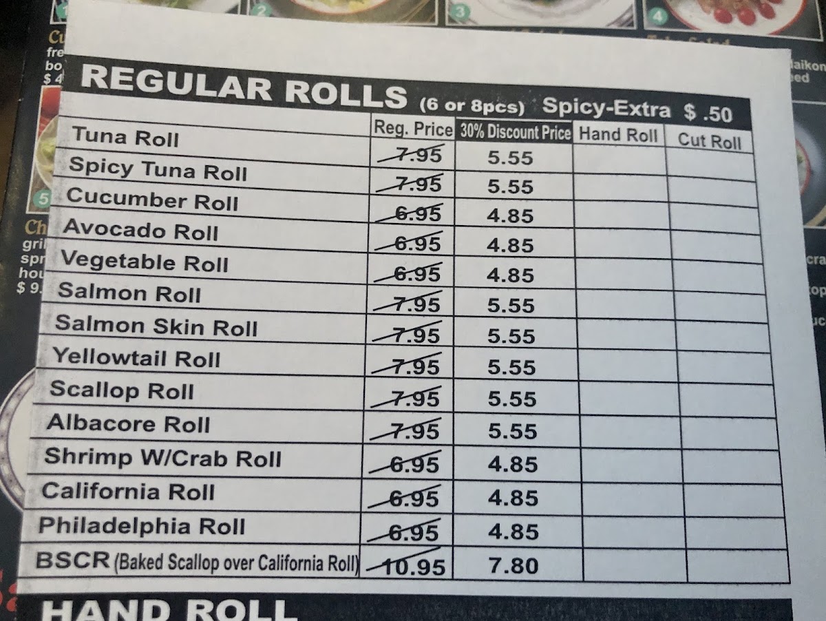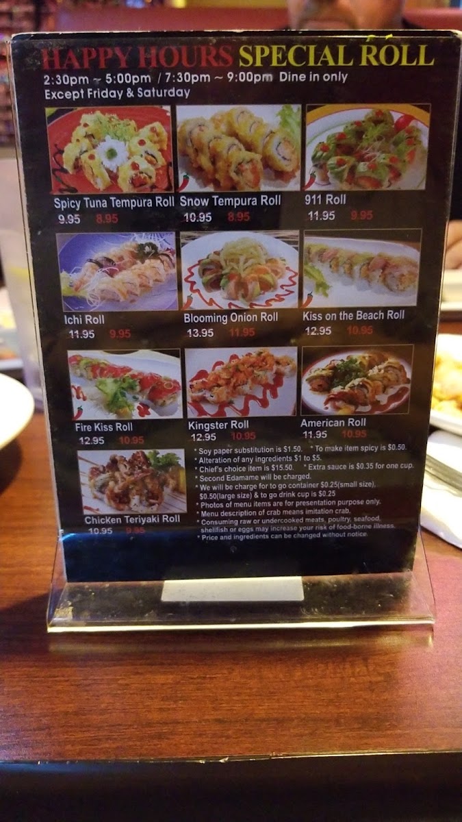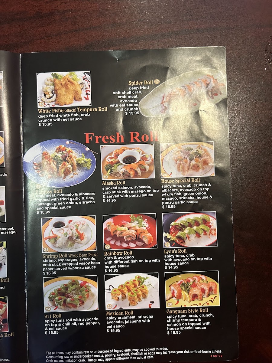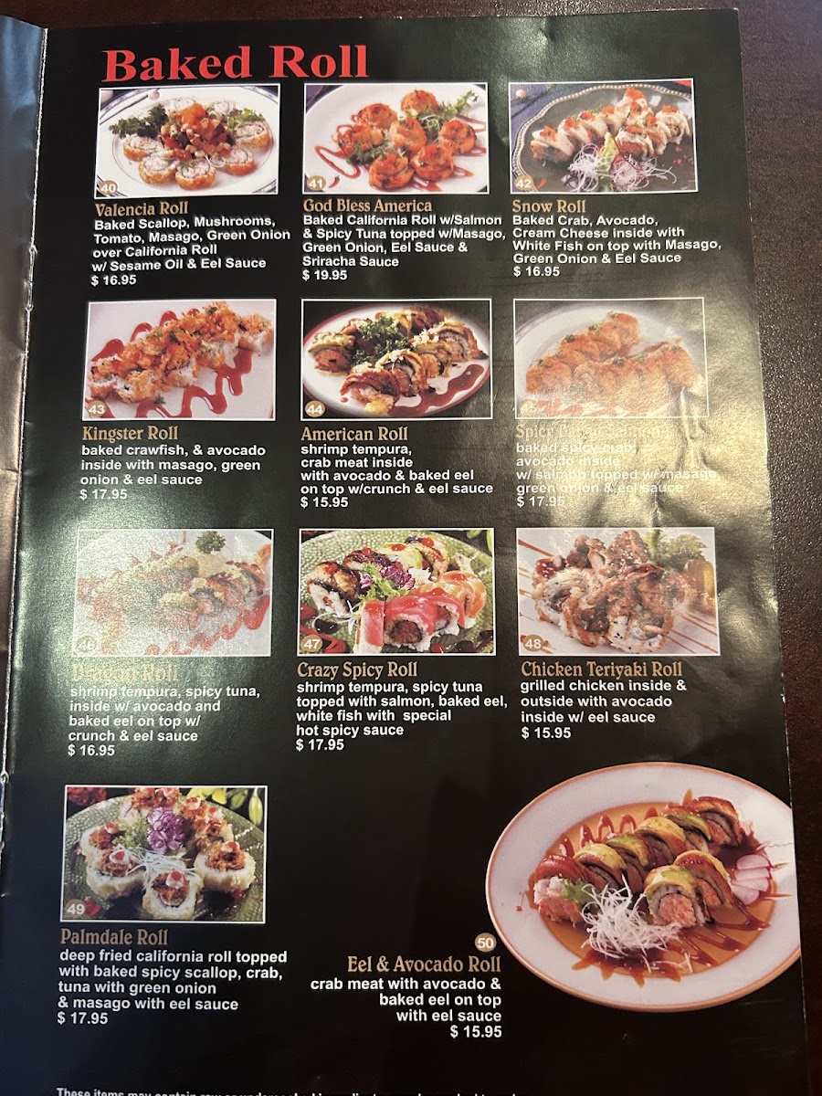 For fans of baked specialties, the menu shines with options like the Crazy Spicy Roll, rich with shrimp tempura and spicy tuna topped with salmon and eel, and the God Bless America Roll, which layers baked California roll, salmon, and spicy tuna with bold sauces. These rolls burst with texture and heat, appealing to adventurous palates.