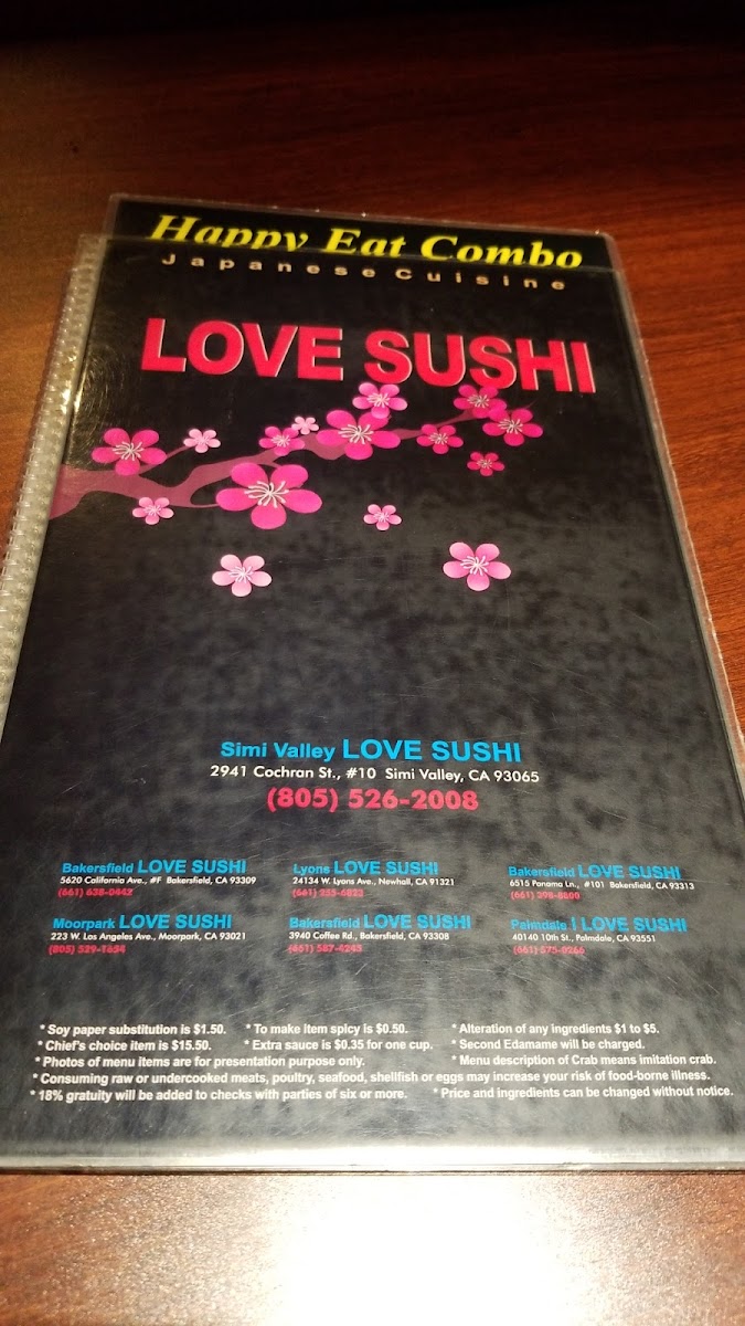Love Sushi in Simi Valley offers an impressive range of Japanese delights with a focus on fresh, flavorful sushi and creative rolls. Their Chirashi, a vibrant bowl of assorted sashimi atop sushi rice, is a must-try at $29.95, showcasing the quality of their seafood. The Happy Eat Combo features chef-selected rolls like the California Tempura, Spicy Tuna Tempura, and Eel Avocado rolls, each priced around $37.95, perfectly balancing taste and portion size.
